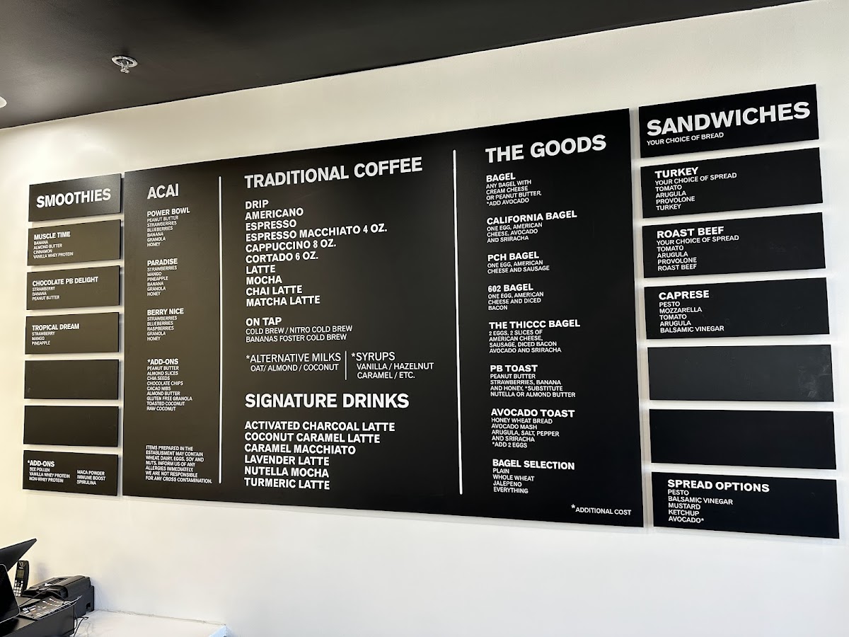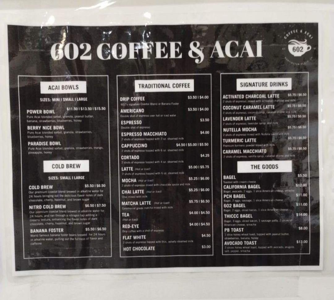 The menu at 602 Coffee & Acai in Huntington Beach offers a diverse range of drinks that cater to all tastes. For coffee lovers, the Traditional Coffee selection includes classics like Drip Coffee, Americano, Espresso, Espresso Macchiato, and Cappuccino. Those seeking a refreshing cold beverage can opt for the Cold Brew, Nitro Cold Brew, or the unique Bananas Foster Cold Brew. The Signature Drinks are a highlight, with options like the bold Activated Charcoal Latte, sweet Coconut Caramel Latte, aromatic Lavender Latte, indulgent Nutella Mocha, and earthy Turmeric Latte. The menu also features seasonal favorites such as the cozy Peppermint Mocha, the fruity Iced Strawberry Milk Latte, and the vibrant Iced Strawberry Milk Matcha. Additionally, adventurous drinkers can try the Camp Fire Cold Brew or one of the energizing Red Bull Infusions. Whether you're in the mood for something classic, seasonal, or creatively crafted, 602 Coffee & Acai offers a wide array of beverages to satisfy any craving.